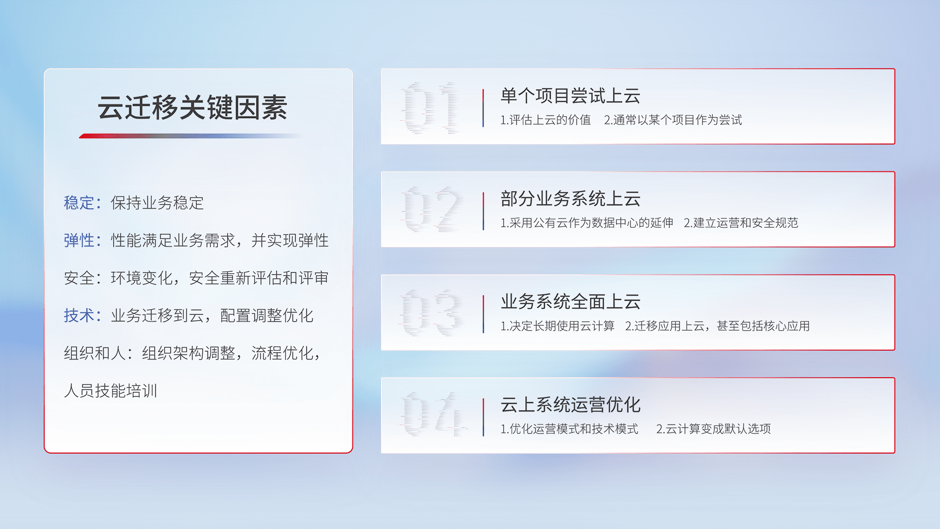 结合实际业务,,,从规划设计、、、云平台选型、、、、云原生改造、、数据迁移、、、集成交付,,,,迁移全过程为客户识别最佳上云路径,,,做好风险识别管理,,,设计网络架构、、身份权限、、、、安全审计合规、、、、操作审计、、日志审计、、、监控告警策略、、、多站点容灾设计等,,对云上基础设施进行整体规划,,,,提升IT治理水平,,,,以满足弹性、、高可用、、、、高性能的需求。。。。