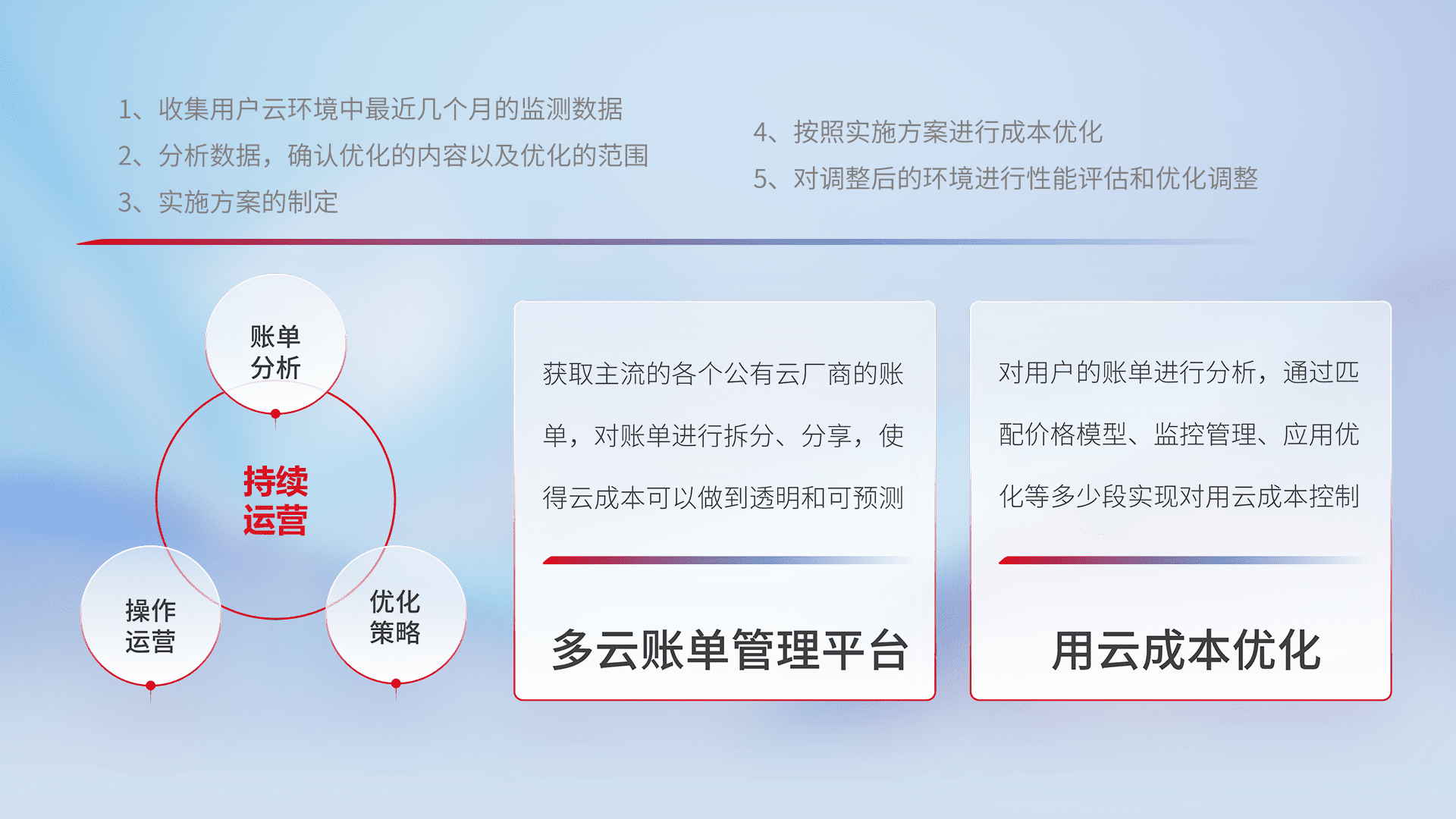 通过多云纳管,,,以统一的资源数据模型把客户的云资源进行抽象和封装,,,,进而实现对多云资源的统一操作,,保障云资源管理的可靠性、、稳定性与可用性。。。。量身定制化运维内容,,,配置、、、、开发运维、、补丁管理、、备份、、、、监控、、认证和访问管理、、、审计和日常巡检等,,,保障在用云过程中的可靠度,,,稳定度以及高可用率。。。